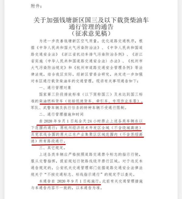 近日,浙江杭州市生態(tài)環(huán)境局錢塘新區(qū)分局決定對國三及以下柴油貨車采取限制通行區(qū)域和通行時間的交通管制措施。