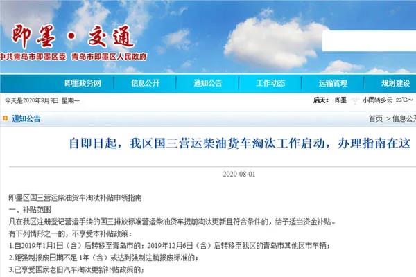 為鼓勵國三排放標準營運柴油貨車提前淘汰更新,改善空氣質量,近日山東省青島市即墨區(qū)交通運輸局發(fā)布了《即墨區(qū)國三營運柴油貨車淘汰補貼申領指南》。明確了國三排放標準的柴油貨車的補貼標準,最高可補貼5萬元。