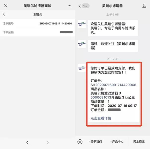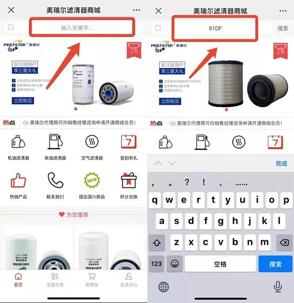 打開(kāi)微信,搜索“美瑞爾濾清器”!公眾號(hào)的功能欄可以直接進(jìn)入美瑞爾的網(wǎng)上商城~點(diǎn)進(jìn)去就可以開(kāi)啟你的網(wǎng)上購(gòu)物之旅,足不出戶,商品給您送到家~
