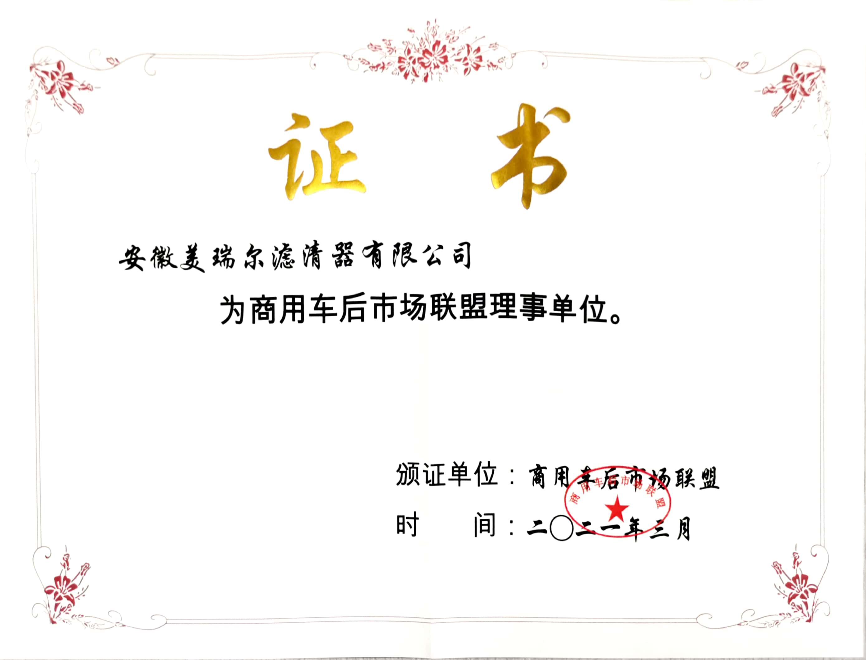 安徽美瑞爾濾清器有限公司,經(jīng)專家評審,被評為商用車后市場聯(lián)盟理事單位,并獲頒由商用車后市場聯(lián)盟頒發(fā)的證書。